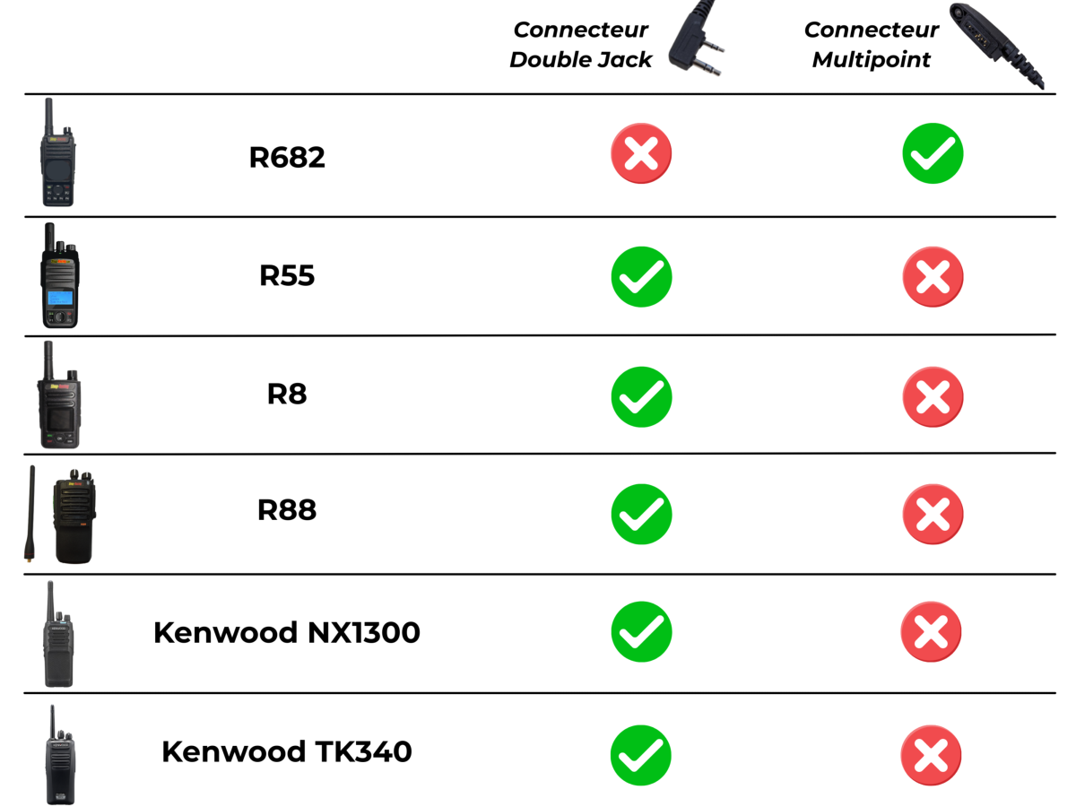 Le kit est équipé d’un connecteur double jack 3,5 mm (espacement 13 mm), compatible avec de nombreuses radios professionnelles utilisées en compétition. Il fonctionne notamment avec les Radios 4G Shop-Racing, ainsi qu’avec les radios Kenwood et d’autres modèles de radios analogiques et numériques équipés de la même connectique.